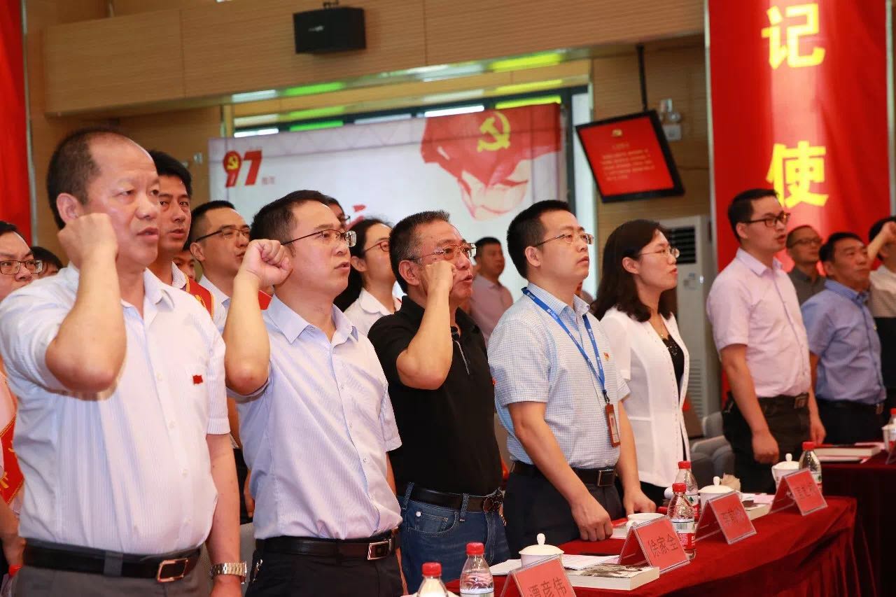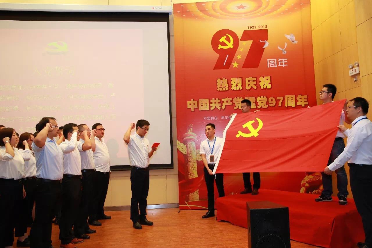 在庄严、肃穆的入党宣誓仪式中,在鲜红的党旗前,大会举行新党员入党宣誓仪式,台下全体党员重温入党誓词。